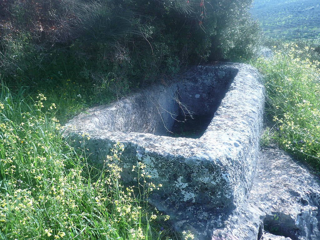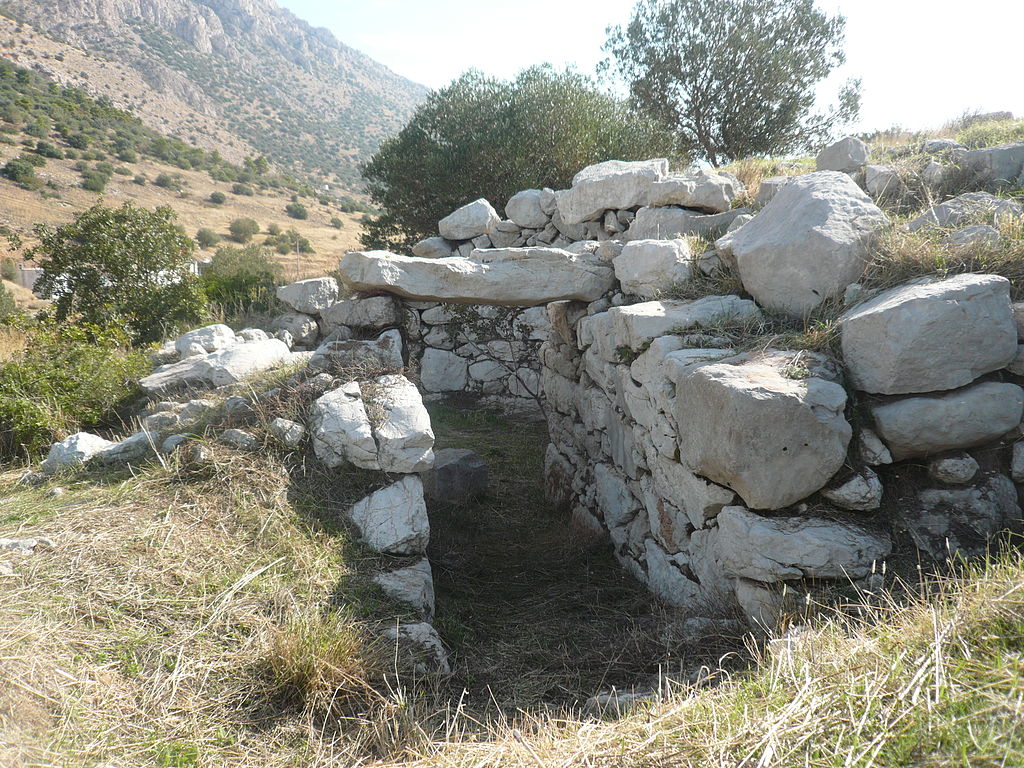 Στην ανατολική πλευρά υπάρχει νεκροταφείο με λαξευτούς ταφικούς θαλάμους, πιθανόν μυκηναϊκής εποχής. Περιμετρικά της ανατολικής πλευράς ο χώρος συνεχίζει να χρησιμοποιείται ως νεκροταφείο, όπως δηλώνεται από την ύπαρξη κεραμοσκεπών, κιβωτιόσχημων τάφων και αρκοσολίων, οι οποίοι έχουν υποστεί συστηματική σύληση στη σύγχρονη εποχή. Από τα ταφικά μνημεία ξεχωρίζει λαξευμένος στο φυσικό βράχο τάφος, με ορθογώνιο άνοιγμα θύρας, κυβόσχημη αίθουσα και τρεις λαξευμένες σαρκοφάγους, ως αρκοσόλια. Σύμφωνα με την παράδοση είναι το Ασκηταριό, ο χώρος όπου ασκήτεψε ο Όσιος Λουκάς ο εν τω Στειρίω. Ωστόσο, η μορφή του παραπέμπει σε προϊστορικό ταφικό μνημείο, το οποίο επαναχρησιμοποιήθηκε κατά την ύστερη ρωμαϊκή και παλαιοχριστιανική περίοδο