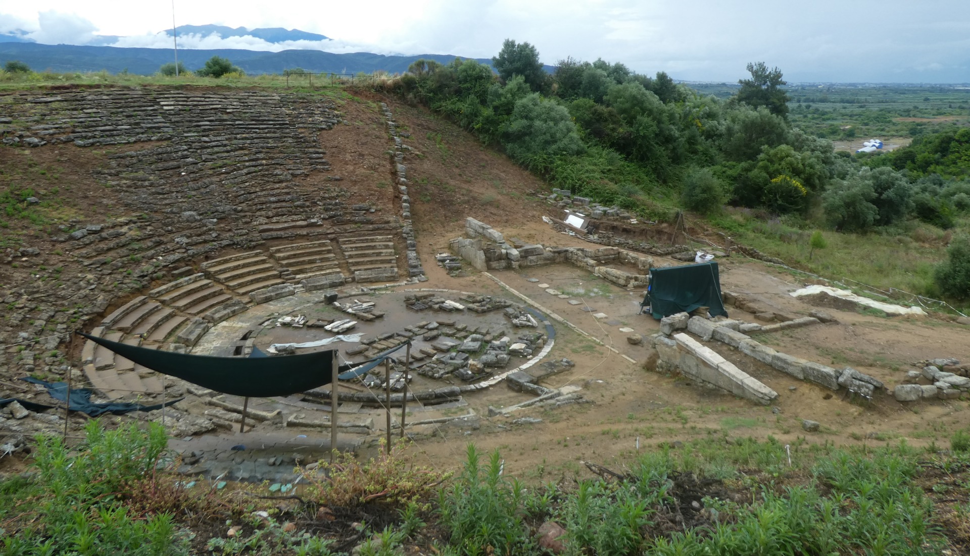 Βαθμιδωτός δρόμος συνέδεε την αγορά με το θέατρο που βρισκόταν ανατολικά του διατειχίσματος. Πρόκειται για το μεγαλύτερο από τα θέατρα της Ακαρνανίας με χωρητικότητα που ξεπερνούσε τους 6000 θεατές. Το θέατρο εμφανίζει τρεις κατασκευαστικές φάσεις, είναι σκαλισμένο ολόκληρο στο βράχο και διατηρεί 28 σειρές εδώλιων δύο διαζώματα και 12 κλίμακες που διαιρούν το κοιλο σε 11 κερκίδες .Το ανώτερο τμήμα του κοιλου είναι σε μεγάλο μέρος κατεστραμμένο και το δομικό υλικό έχει αφαιρεθεί. Το σκηνικό οικοδόμημα είναι ιδιοτυπο και φέρει πλευρικές ράμπες έχει ημικυκλική ορχήστρα με περιμετρικό οχετό ενώ γύρω της διατηρούνται προεδρίες. Στην τρέχουσα φάση βρίσκεται σε εξέλιξη από την εφορία αρχαιοτήτων Αιτωλοακαρνανίας και Λευκάδας υλοποίηση του έργου στερεώσεις του μνημείου